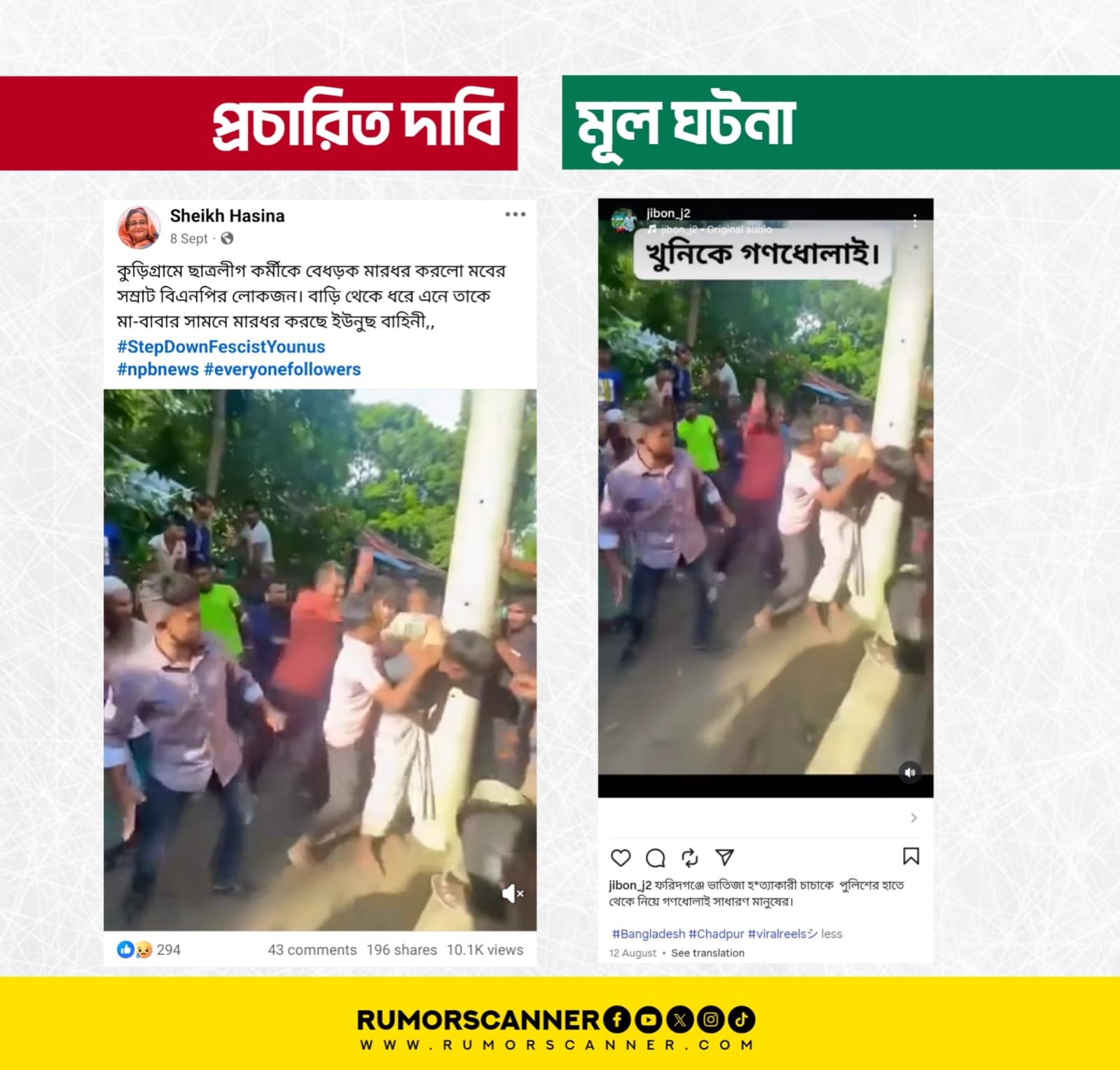 রিউমর স্ক্যানার টিমের অনুসন্ধানে জানা যায়, আলোচিত ভিডিওটি কুড়িগ্রামে ছাত্রলীগ কর্মীকে বিএনপি কর্তৃক মারধরের ঘটনার নয় বরং, চাঁদপুরে ফরিদগঞ্জে ভাতিজাকে খুনের দায়ে ক্ষুব্ধ জনতার হাতে চাচাকে গণধোলাইয়ের ভিডিওকে উক্ত দাবিতে প্রচার করা হয়েছে।