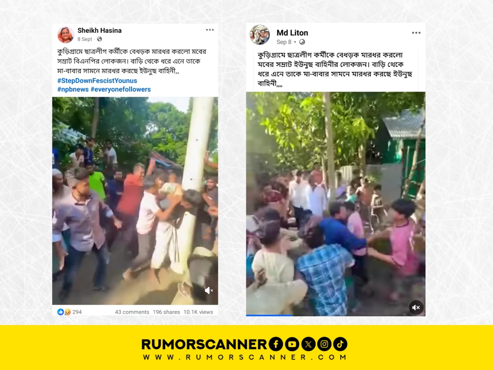 সম্প্রতি, “কুড়িগ্রামে ছাত্রলীগ কর্মীকে বেধড়ক মারধর করলো মবের সম্রাট বিএনপির লোকজন। বাড়ি থেকে ধরে এনে তাকে মা-বাবার সামনে মারধর করছে ইউনুছ বাহিনী” দাবিতে একটি ভিডিও সামাজিক যোগাযোগ মাধ্যমে প্রচার করা হয়েছে।